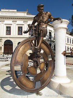 En las ruedas de la bicicleta está escrito el nombre de las ciudades con las que está hermanada Nagykanizsa (Puchtein -Alemania-, Kovászna - Covasna, Rumanía-, Csáktornya - Čakovec, Croacia-, Salo - Finlandia -, Magyarkanizsa -Kanjiža, Serbia-, Akko - Israel-, Gleisdorf -Austria-, Shianyuang -China-, Kazanlek -Bulgaria-, Königsee -Alemania-, Ptuj -Eslovenia-, Bihać - Bosnia- y Togliatti -Rusia-).